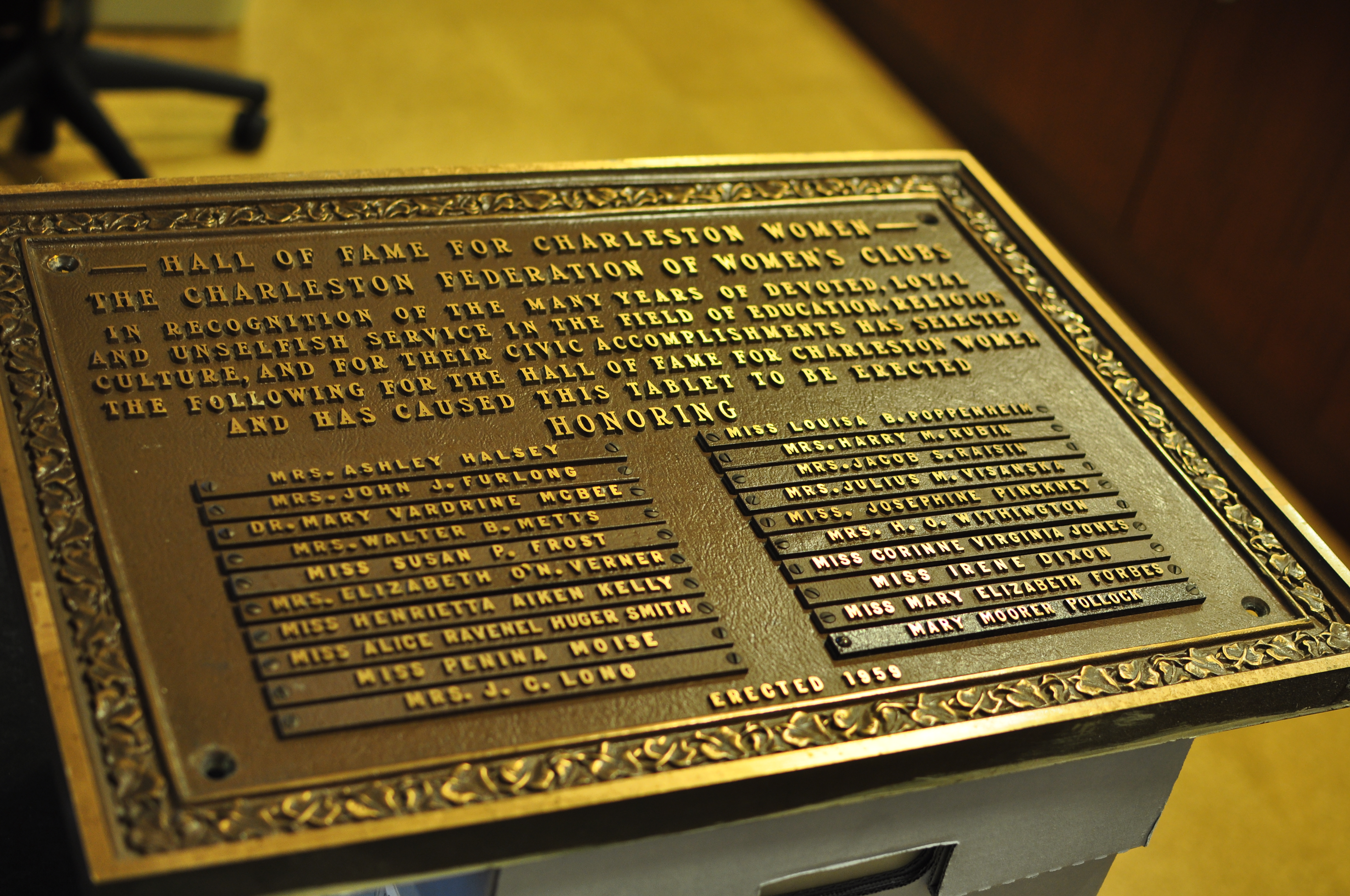 Our first task for this project was to develop a good understanding for the site and the neighborhood that contains it. I thought the logical place to start was the Corinne Jones park itself and so it was there I found myself this morning taking pictures and looking for anything significant or distinguishing. I began to wonder, “Who is Corinne Jones?” “Why is this playground named after her?” I was certain that this information could be found with a simple Google search but perhaps not. Maybe the identity of ‘Corinne Jones’ would be more elusive than one would expect? I decided to ask a man who was standing next to a City of Charleston vehicle and seemed to be coordinating the maintenance of the park. He told me that, “The park was named after Corinne Jones, who was a black lady who did a lot of good things for the neighborhood.” He didn’t have anymore specifics but he mentioned that City Hall had a plaque with her name on it and that they would be able to give me more information. I had never been to City Hall but I shouldn’t have been surprised that I had to walk through a metal detector and security check to get inside. After the security officer deemed me suitable to enter the same building where the Mayor works, I stepped into the elevator and eagerly awaited the unveiling of Corinne Jones. The Mayor’s secretary, who was both incredibly pleasant and helpful, disposed of all of her resources in an attempt to assist me. She contacted the Archives Department, the Parks Department and a few other potential resources until she became just as curious as myself as to who this ‘Corinne Jones’ really was. She took my phone number and promised to let me know of any information that she could find. Meanwhile another lady working there searched through the minutes from their last meeting and discovered that the supposed plague was recently moved to the third floor of Addlestone Library. Addlestone Library is a large building however, it didn’t take me long to search the entire third floor and realize that the plaque was no where on display. I rang the bell for the Special Collections department. I described the item I was looking for and after some time they brought forth “The Hall of Fame for Charleston Women” plaque. Corinne Jones was one the list, but the only additional information it gave me was her middle name Virgina and that she was not married.