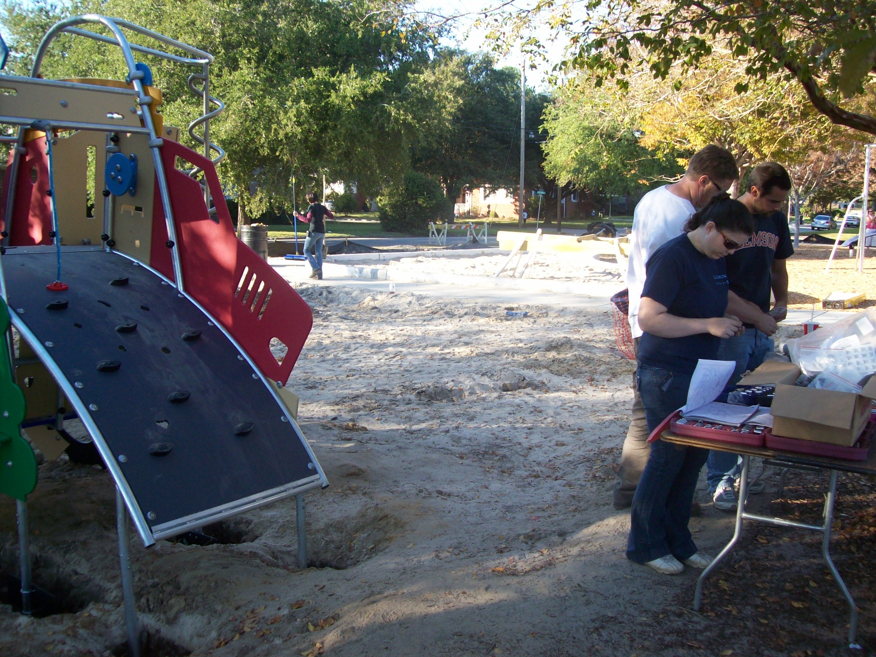 It has been a busy day for Studio V, and much has been accomplished at Corrine Jones Park, and at our Simons Street shop. The day began early, with most of Studio V meeting at the park with shovels and ratchets in hand, ready to get to work on assembling the new playground equipment being installed. After a brief doughnut break courtesy of Sara, we began assembling the many panels and hundreds of screws and bolts that make up the ‘Home-Rescue’ structure in the younger children’s area of the park. It seemed like everyone was at the park today, including Matt Compton and Beth Brownlee with the Charleston city parks. As Studio V was slowly but surely assembling ‘Home-Rescue’, Matt and Beth were also working on assembling the swings and spring toys- the water fountain was installed as well.