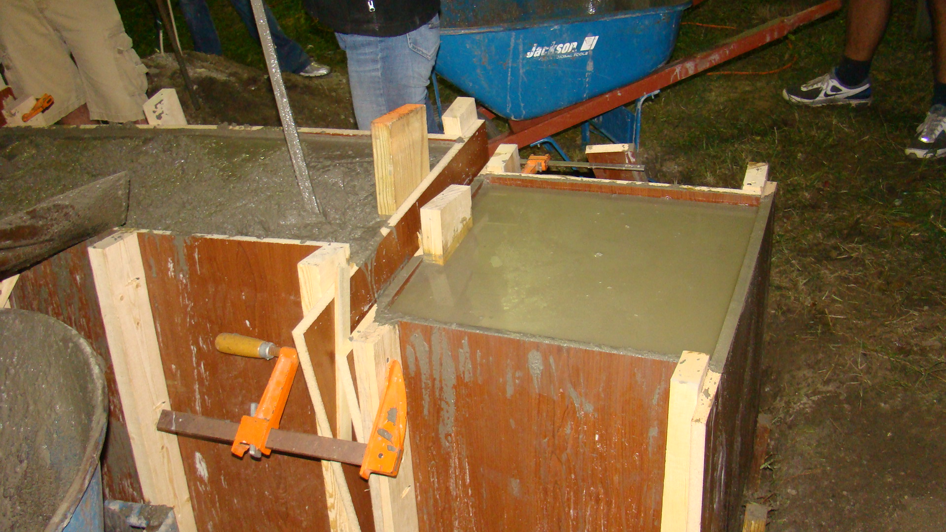 The result? A very beautiful section of our segmented concrete wall, curing as Charleston sleeps. It’s not to say we’ve not had any problems; between shopping for materials this evening (after returning from a field trip at 7:00 PM of course), screwing together formwork [correctly], and hand mixing concrete to a consistent consistency between multiple batches, it’s been a bit of a challenge to piece together these sections of wall.