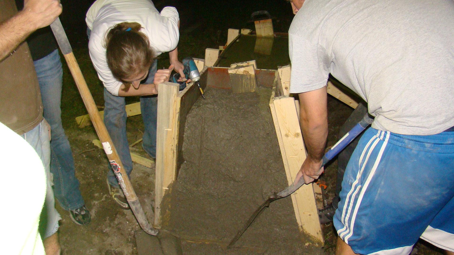 However, our biggest delay came as we were filling our last wall segment with concrete; so close to being done were we that this last batch of concrete would have filled our mold completely. I’m sure it was actually during our last shovelful of cement that, by some odd stroke of bad luck, a wall of our formwork failed and popped off the frame, letting loose the concrete held behind it (i.e. a blowout). Fortunately for us, most of the concrete was self contained from its own massive weight, but seeing some spilled on the ground, we started to come to the alarming realization that our formwork would not be strong enough to hold such a large volume of material.