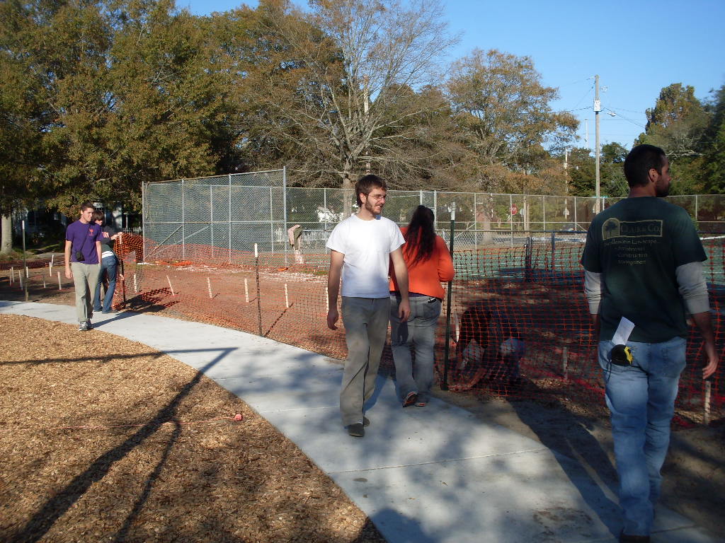 With Studio V’s schedule set for November, everyday revolves around meeting a set deadline. Tomorrow marks an important day in our schedule as it is our groundbreaking day of construction on site. Scheduled for 7:30 A.M tomorrow morning, our foundation for our structure will be excavated with the help of heavy machinery and the city of Charleston. Prior to this removal of earth on site, Studio V was left with the challenge of accurately marking out exactly where our foundation will rest on site. In order for our structure to erect itself accurately as portrayed on our master plan, this was an important and vital process to the success of our project. Our efforts began early this morning with a group of students recording precise measurements in which we could then transfer into AutoCAD and create a grid system. Creating this grid gave us base points where our structure began and ended as well as points to base our radii from to achieve the unique curves of our structure. Once this information was complied, Studio V hit the park with measuring tapes, spray paint, string, hammers, and wooden stakes to lay the foundation footprint. Unfortunately, this process will need to be repeated at least one more time considering the track hoe mostly likely will disregard our stakes and markings tomorrow morning when digging. In efforts to prevent removal of the stakes once we left by tempted individuals, the area was temporarily zoned off limits with recycled fencing found on site. It is likely this wont stop intruders of being mischievous but it was the thought that counts at least. As Thanksgiving nears, Studio V will continue their grind day in and day out and as always, we are very excited to see our project coming closer to completion.