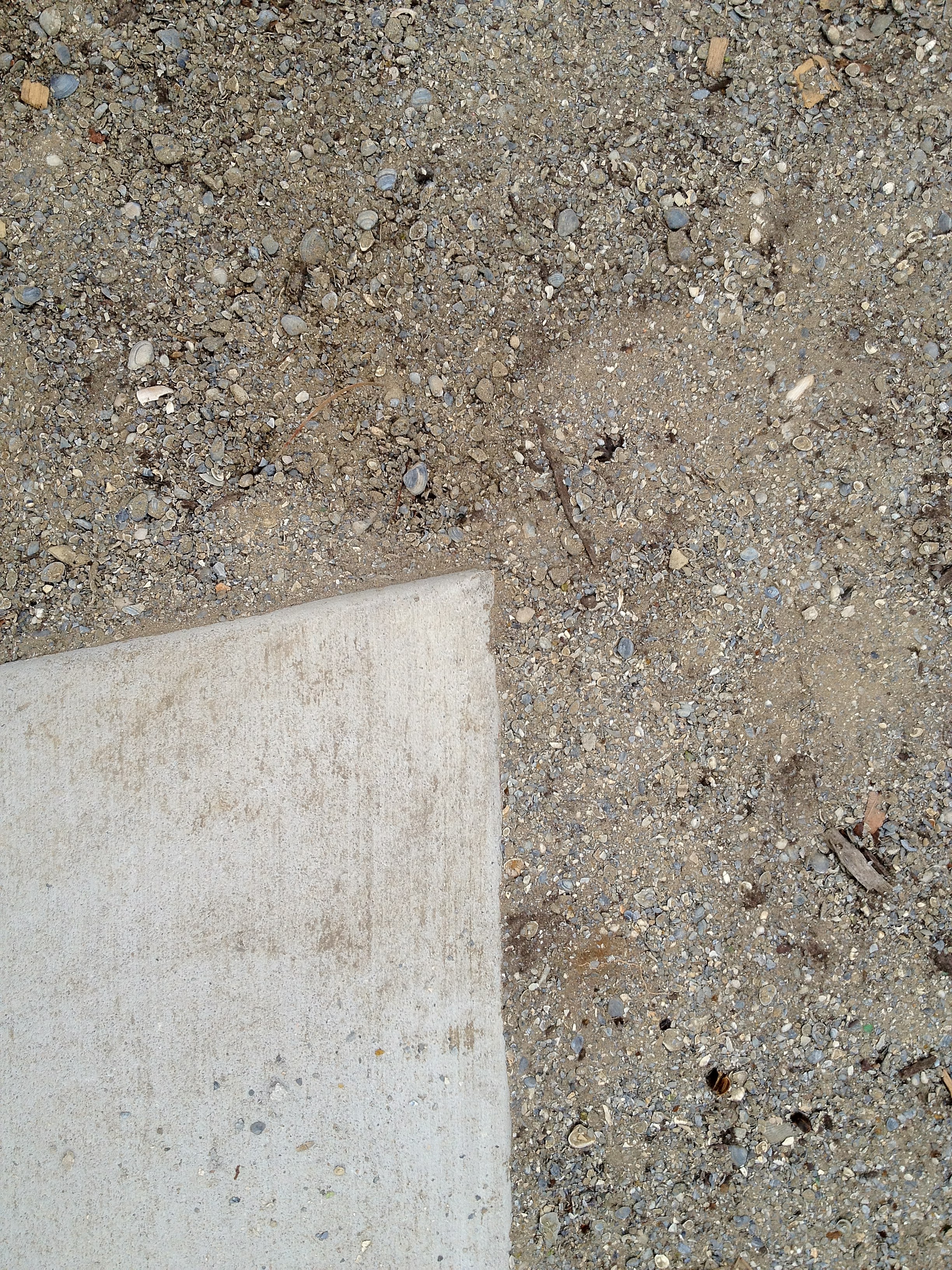 Dec. 28:  The city installed a crushed sea shell material between the concrete pads that compacts much better than the glass.  Although this solution is not as interesting as the glass, it functions well.  I hope to further test using tumbled glass in this type of application in the future though.  I think that adding some type of additive, like a resin or glue will help solidify and make it a viable option.  Below is a picture of the crushed sea shell: