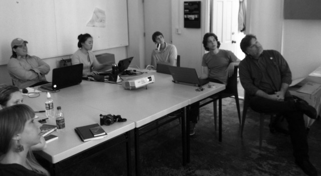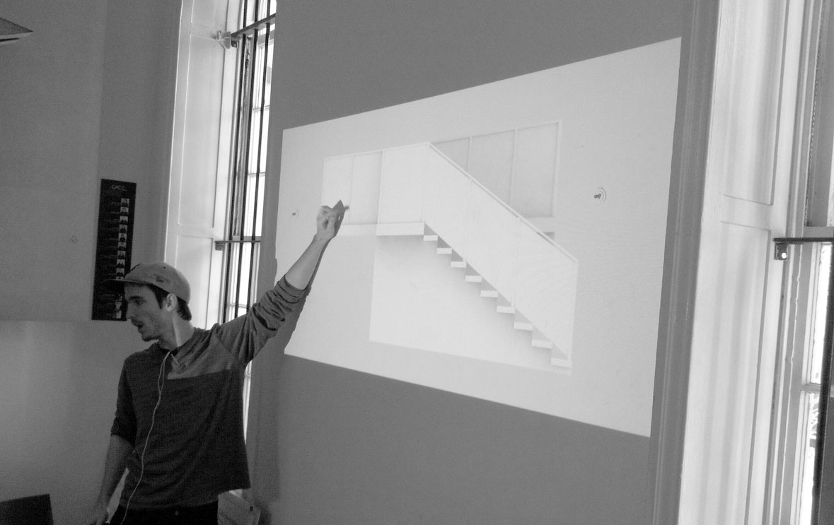 The decision has been made! After meeting with Mark Sloan, the curator and ultimately our client for the project, we have choosen to move forward with the original scheme. The two schemes were modeled and shown one on top of the other (literally two projectors stacked on top of eachother) and each group took turns explaining why they made the changes that they did to the design. Once each team finished, Mark asked that one person from each group basically battle it out with each other explaing why their scheme should be choosen and why their fellow classmates’ should not. There was definately some tension in the air, but after much debate and discussion Mark felt that by revealing the stairs the visitor would know exactly where to go in order to get the best view of the artists’ work. After solving some of the detailing challenges we were unsure of with our original design, it became clear that continuing with the first scheme was the best move.