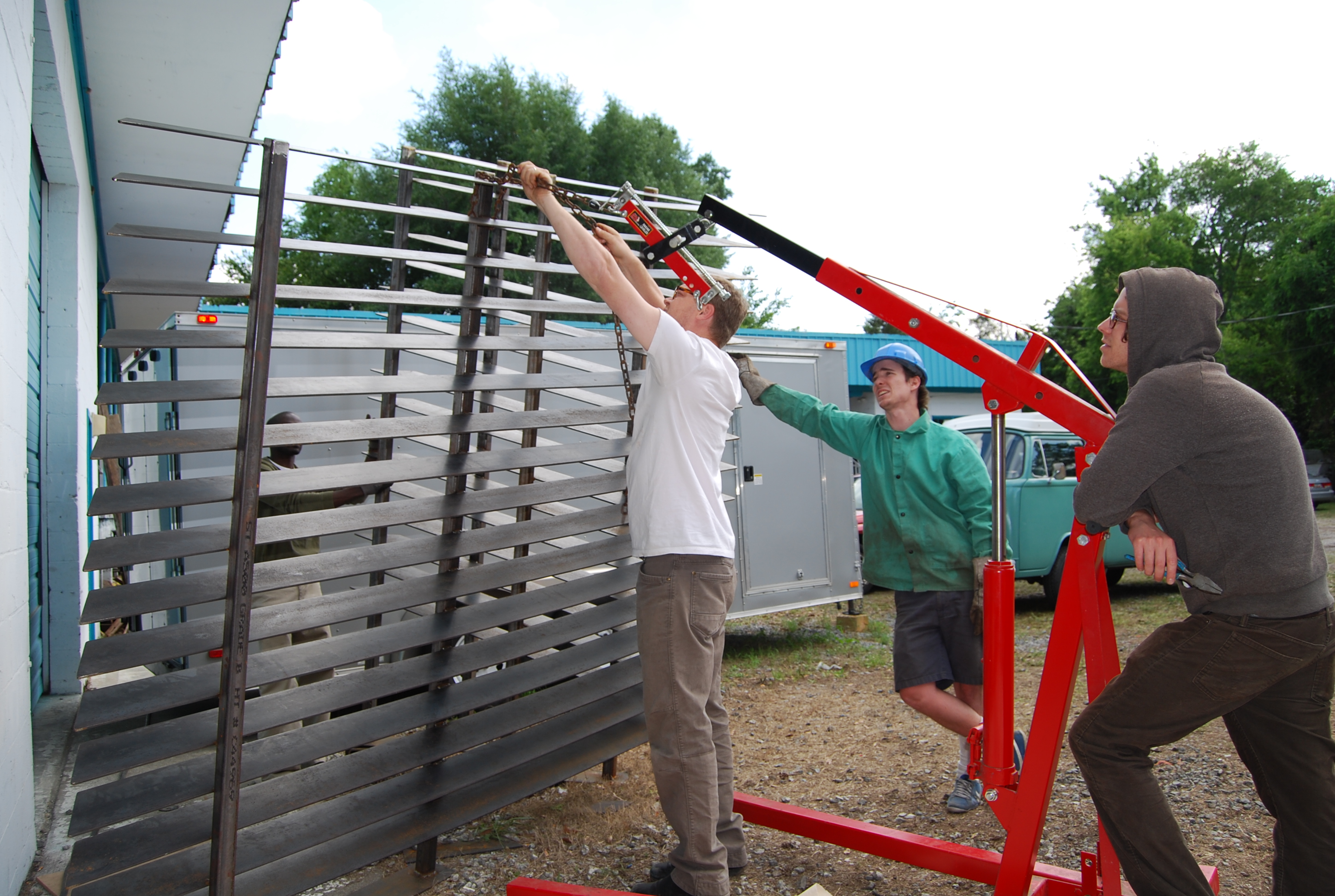 The wood arrived Monday as we began to finish up the inner steel structure of our platform. We had to break up into a number of smaller task groups to get some things done, and that we did. Over the weekend we bought paint for our outdoor structure, so we began painting and finished with touch-ups on Tuesday morning- outdoor structure complete! Chris and Sam got the space ready outside the window of the Halsey Gallery for us to install it, so it should be in place by the end of the week. Meanwhile, we are almost finished with our steel structure for the indoor platform. We are making some minor adjustments and will be ready to weld on the structure for our hand and guard rails. Then, it’s on to preparing the “shell” of our platform- the wood. We have most of the pieces ready to be glued together for stair treads, and have mapped out how to cut our hand and guard rails from the boards. Still lots to do. It’s getting a little hectic with ITC students all being there with us all day, and with our time slot growing smaller by the minute. Six days and counting until we move into the Halsey!