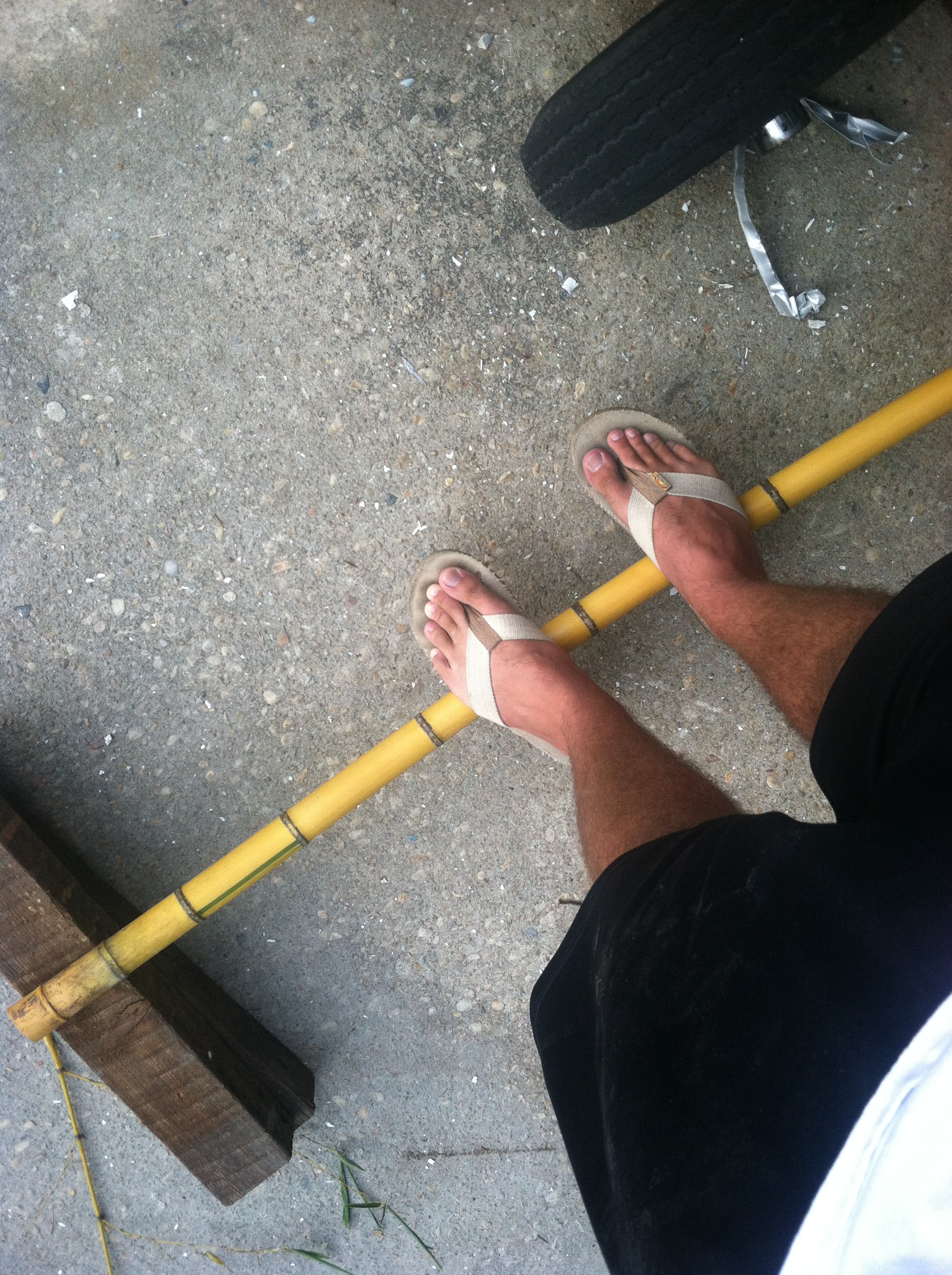 Yesterday at the end of studio Sam called a local bamboo farm and headed over to his place to see what he had to offer. She said that the “farm” was his backyard and it was incredible to see the amount of bamboo he had. He let her take a few stalks back so that she could share it with the studio. We experimented with different styles of joining the stalks of bamboo and also tested the strength that the largest stalk had. I grabbed some scrap boards outside the shop and placed the stalk across them then proceeded to step up on it to see if it would break. To my amazement a two inch in diameter stalk easily held up my 200 plus pound body with only a little deflection.