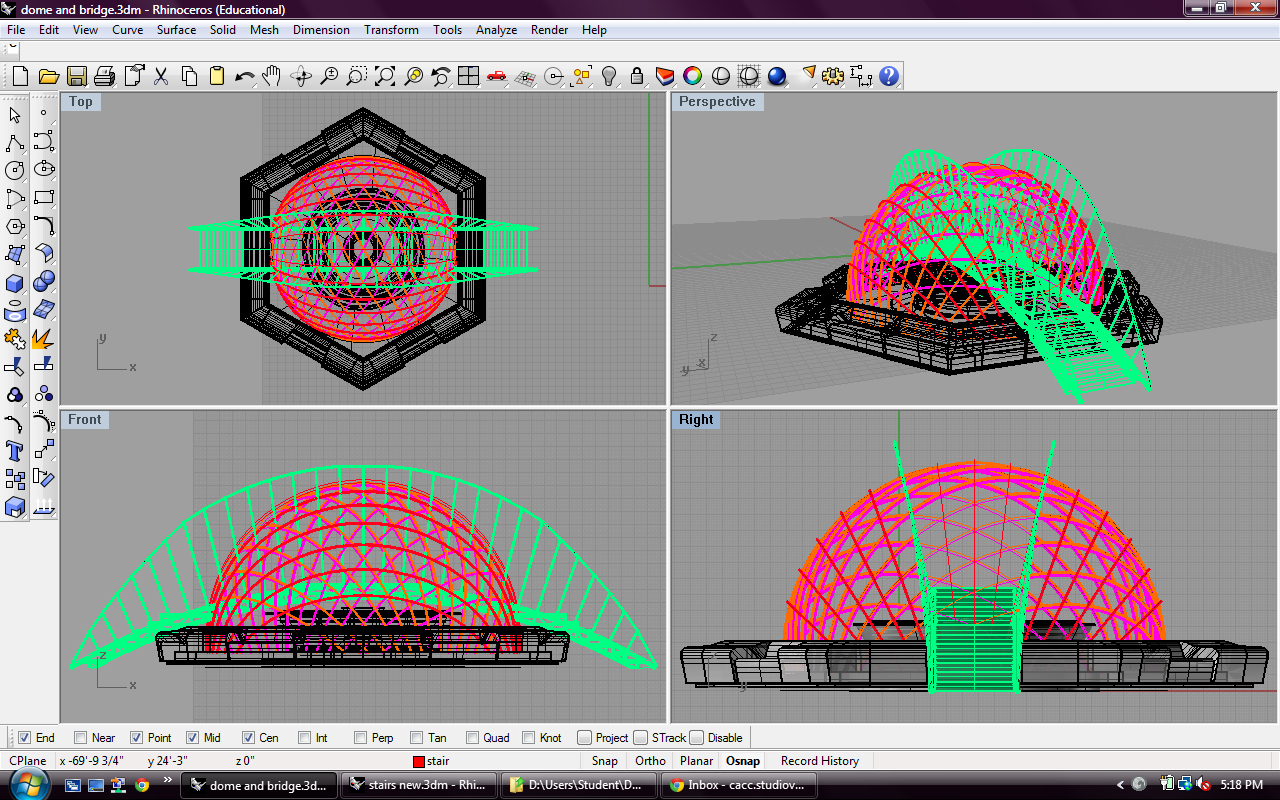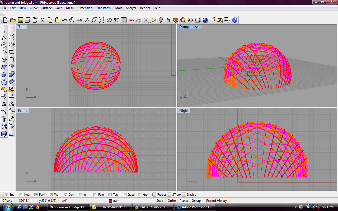 If we build this model accurately on the computer, we will have the lengths of each piece and know exactly where every intersection is supposed to happen. Then we can create a numbering system and assemble the parts on site. The process of building the dome, stairs and superfly on the computer is taking a long time but it should make our lives a little easier in the next few weeks.