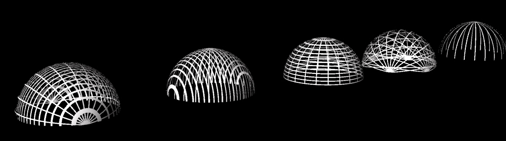 Over the last couple weeks we have found that 3D modeling our design is going to help us a lot when it comes time to build. We started with simple dome studies and decided that we liked the dome that has all its pieces radiating from six points (second from right in the picture below).