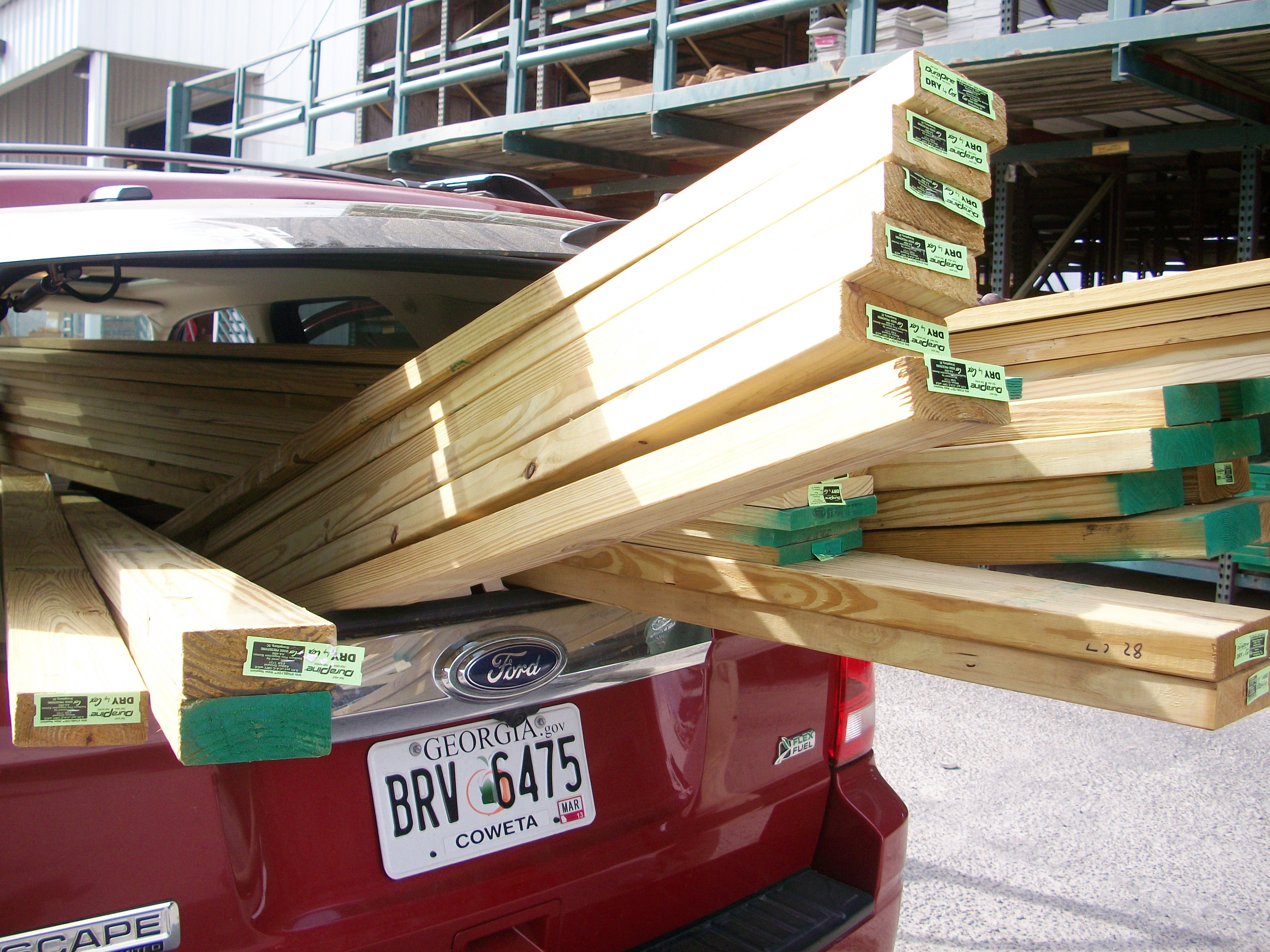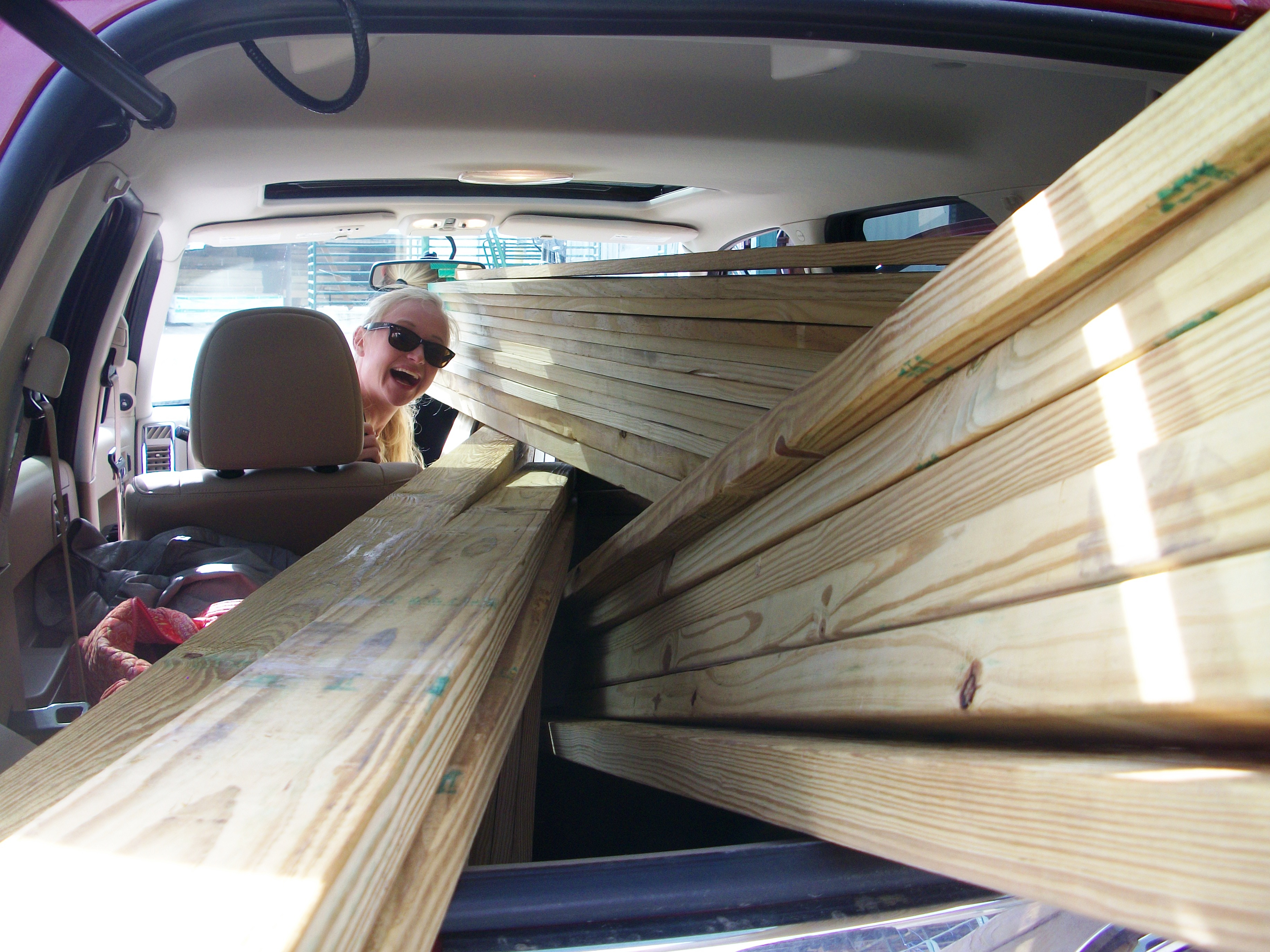 While we wait for permits and forklifts, we have turned our attention tonight to the smaller pieces of the GAP Shed. Ashley and I visited Southern Lumber to buy lumber for our railings / counter support and wall trim. The load of wood was bigger than we expected! Trying to fit it all in her vehicle was a challenge. Once back at the shop, we cut and assembled all of the vertical supports for the counters.