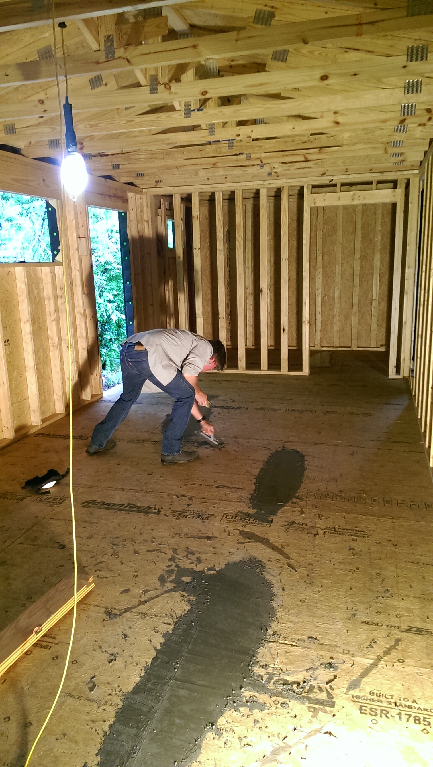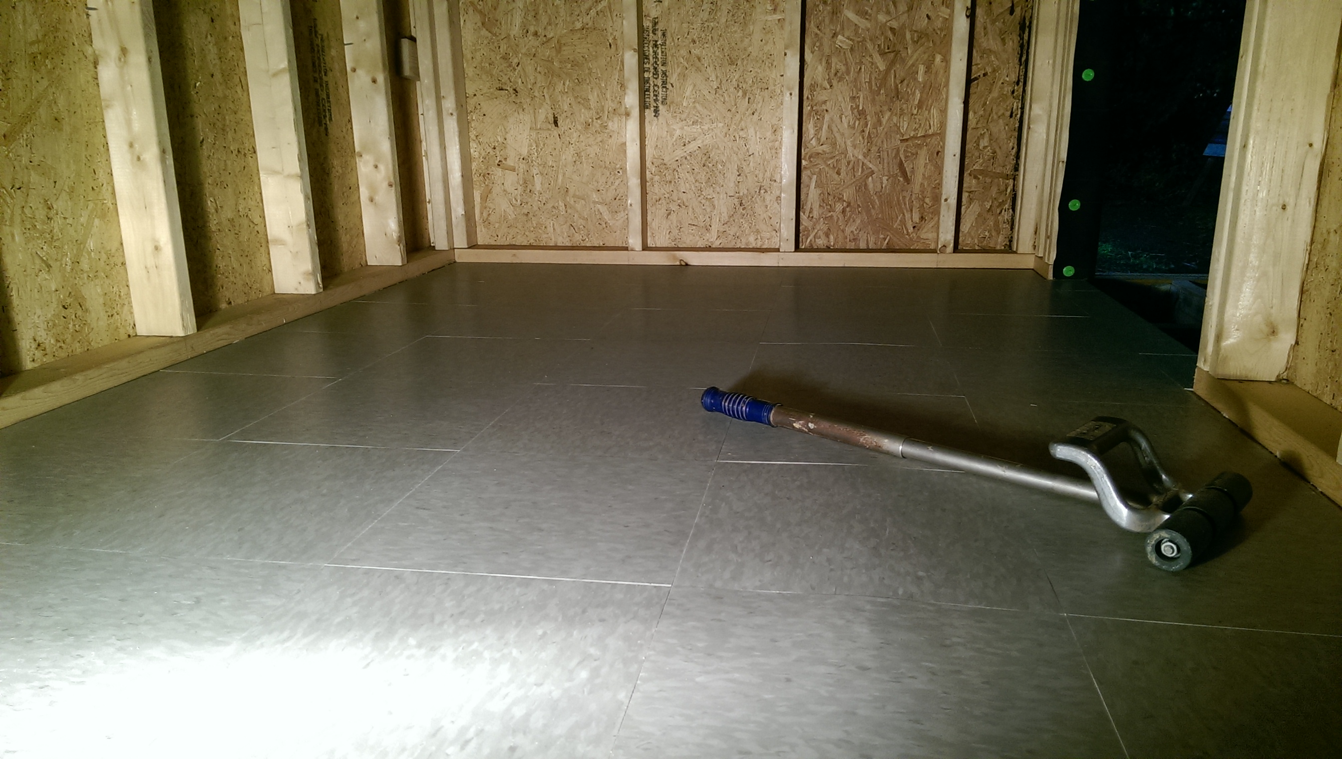 As this was going on, Jamie and Joel worked on leveling out the floors of the interior spaces to prepare them for the vinyl. Harry Crissis joined our work force today and hopped on board with these guys. The utility closet floors have already been installed, but the Quikcrete mix laid in other parts of the kitchen has to dry before vinyl can be laid.