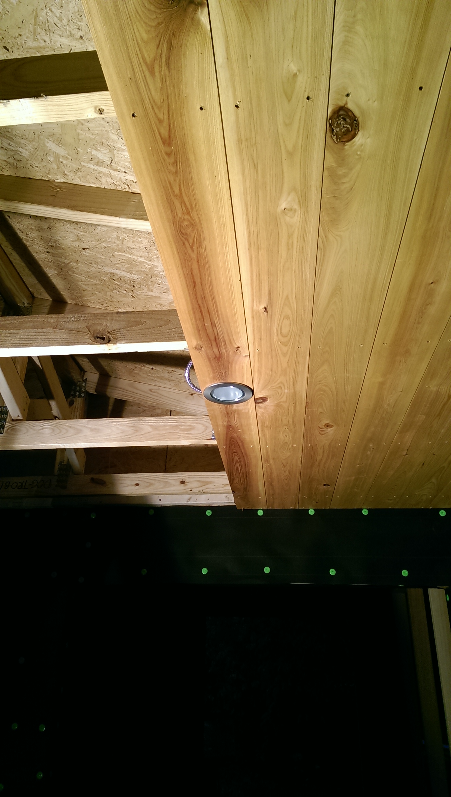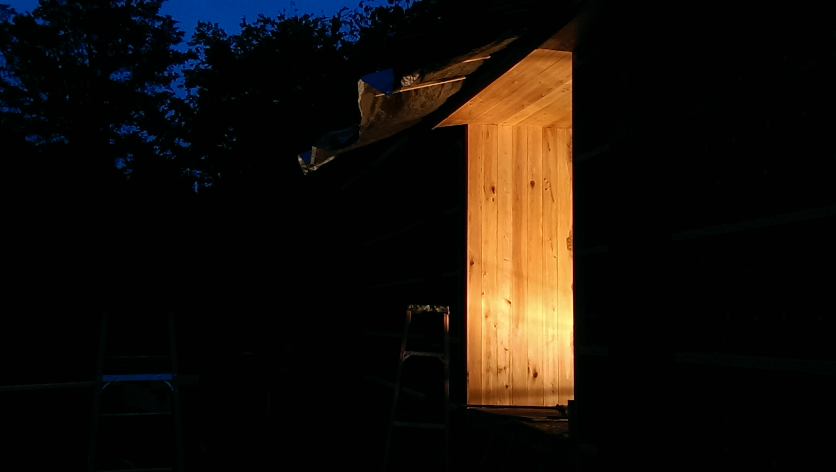 Meanwhile, Paul and Nolan were busy at their usual post of applying cedar in the dogtrot. They completed as much of the ceiling boards as they could (the rest have to wait until after electrical is run) and then moved on to the siding. This is another area of the project that requires meticulous attention to detail. The gaps between the siding, ceiling boards, and deck boards all need to match and align in order to have the desired effect of a continuous band of wood. Paul and Nolan have been doing a great job of ensuring this vision is reached. Once again, the results are pretty spectacular.
