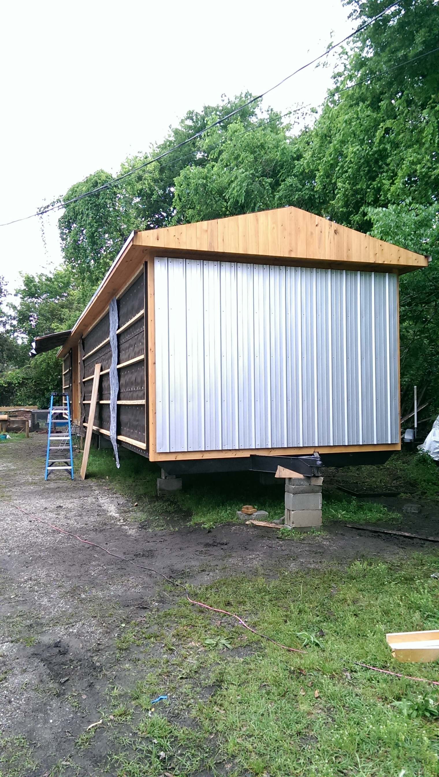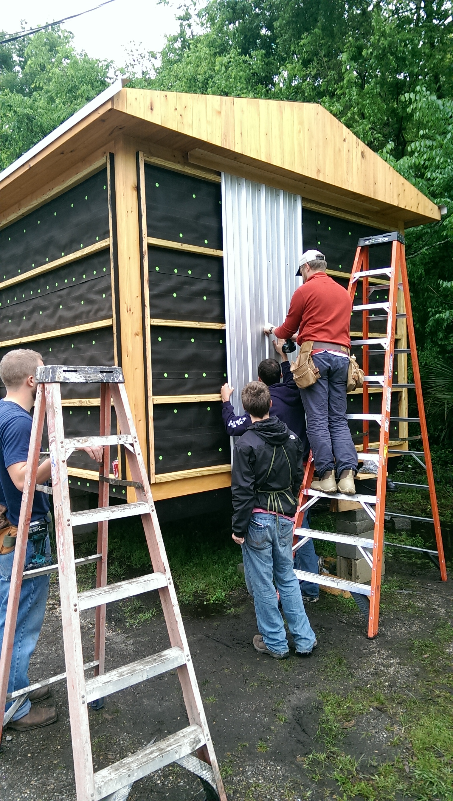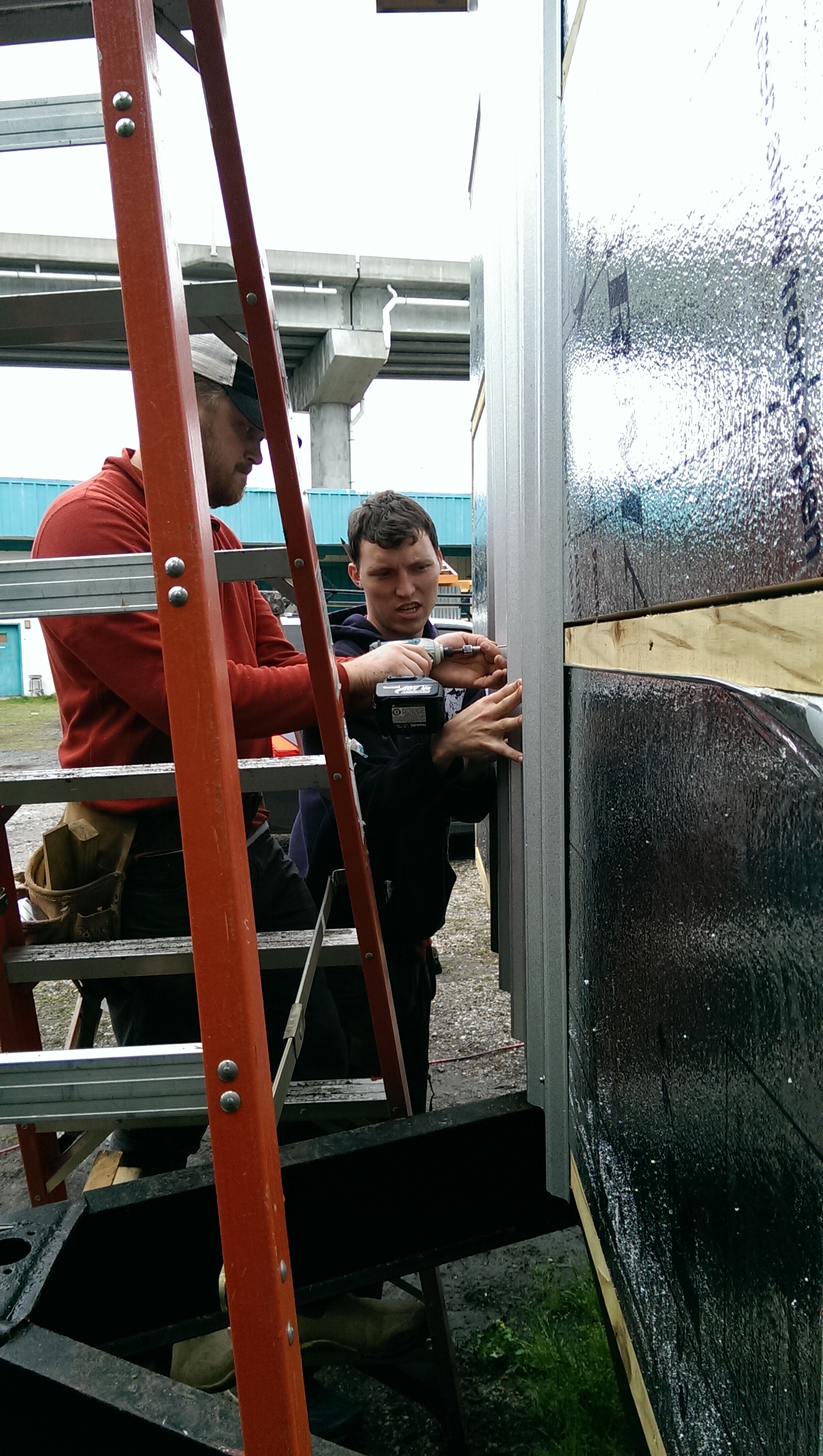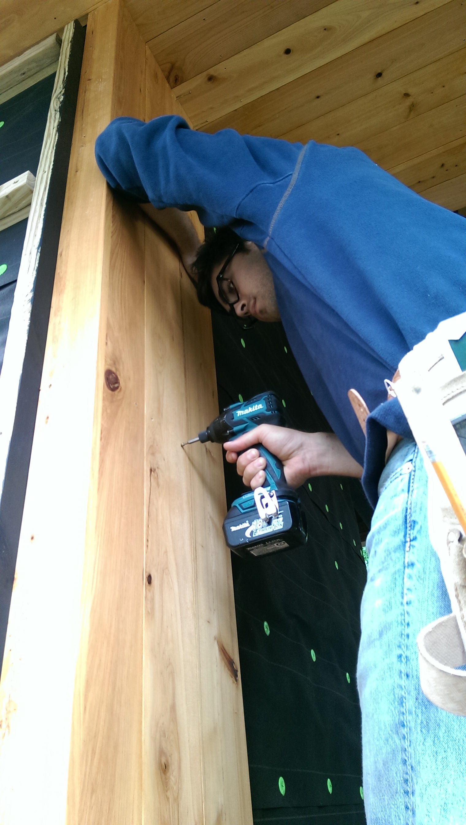 But this morning sure wasn’t. Chris, Nick, Professor Pastre and I had planned to start the day with putting up the first wall of metal. However, after our first attempt at application we found many issues with the way the wall had been built. Furring strips were not placed correctly, trim boards did not fit flush on the corners, and the top and bottom trim lengths needed adjustment.