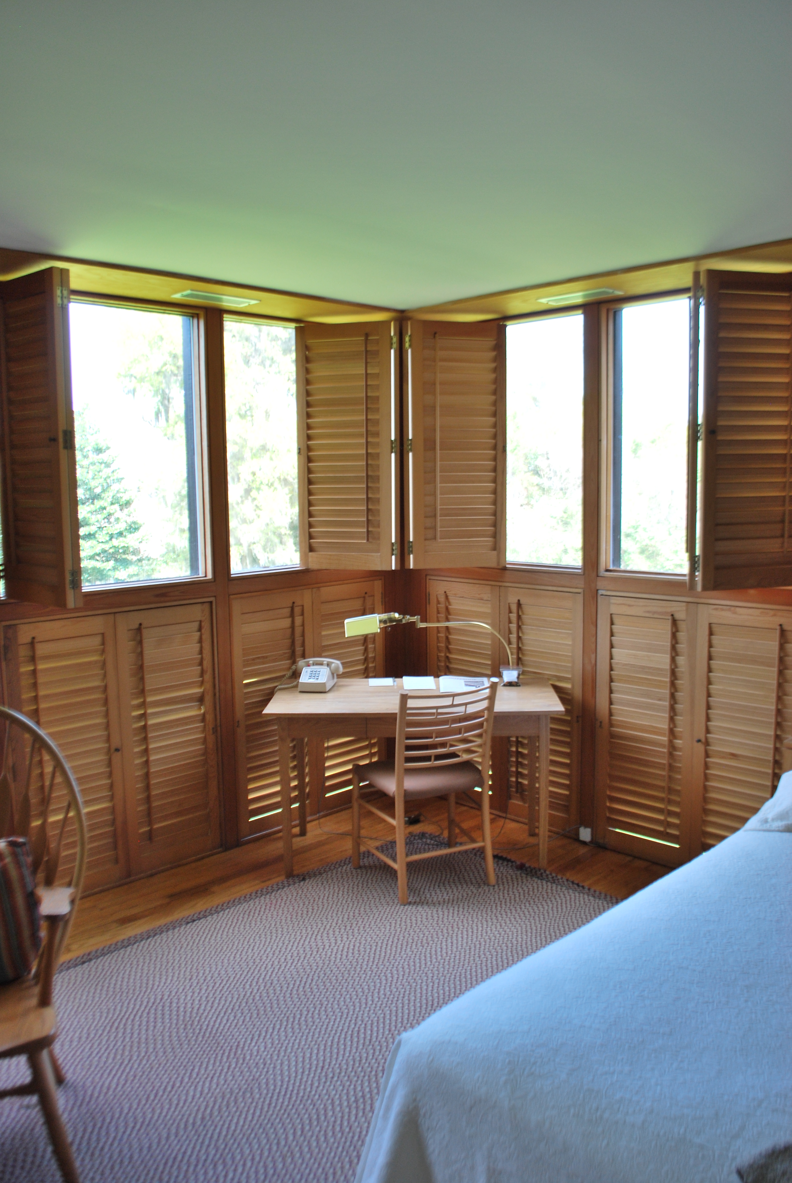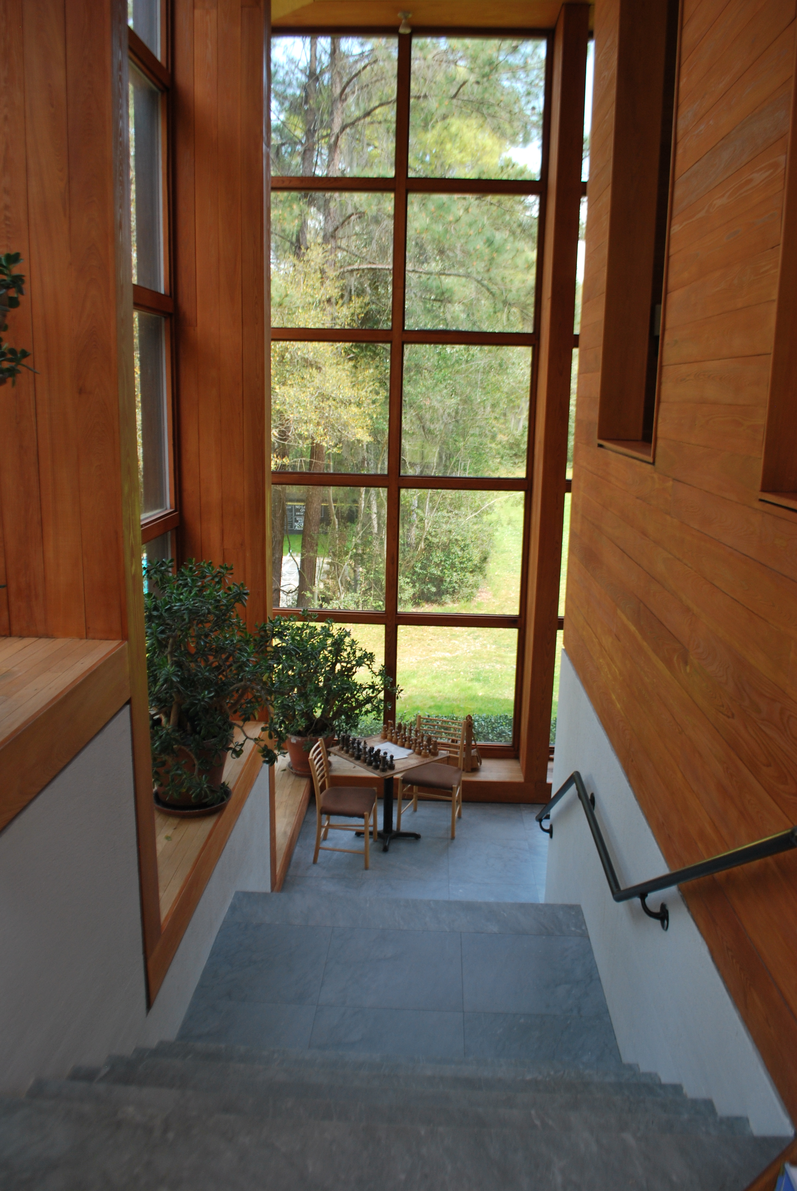 The beautiful reception room and stairs leading to it really show off the beauty of the wood with a full bodied stain. While in the bedrooms, the more nature, soft color of the cypress comes through, making the rooms calm and quiet.