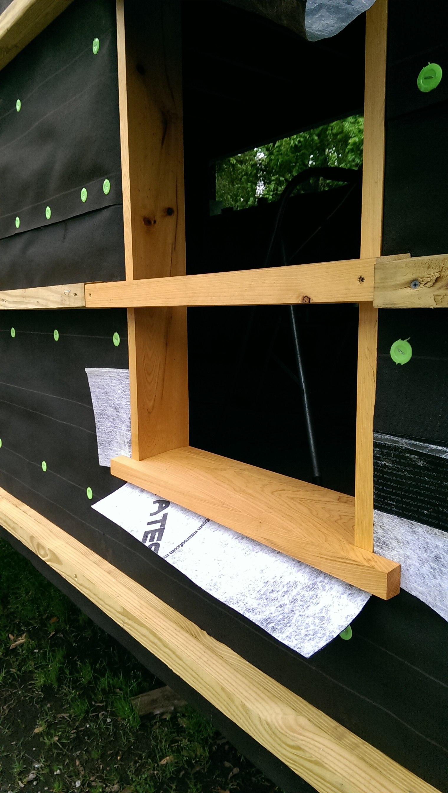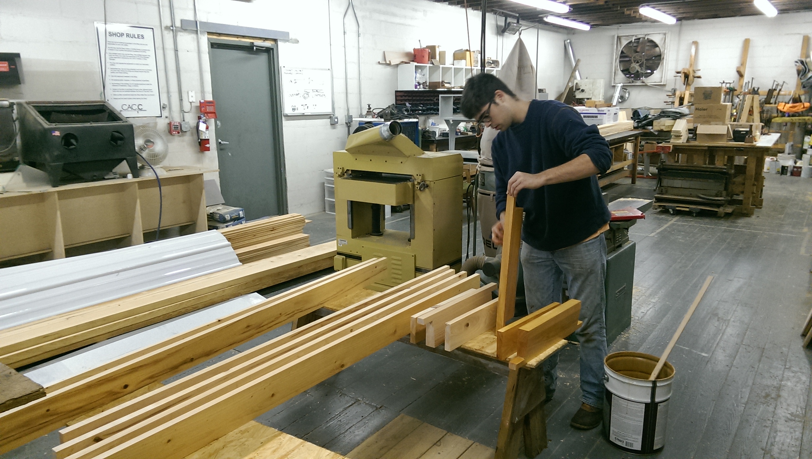 So much for that day of rest. Studio V celebrated Easter Sunday in style by pulling another 12 hour work day. With so much to be done before this coming Friday, our time for relaxation and reflection will have to wait. We started the day staining the jamb pieces Professor Pastre had made the night before so they could be assembled this afternoon. Once they were dried, each jamb was assembled and put into place in the vertical window frames. It’s a shame these beautifully crafted pieces of the building will hardly ever be seen once the sheathing and glass are put up.