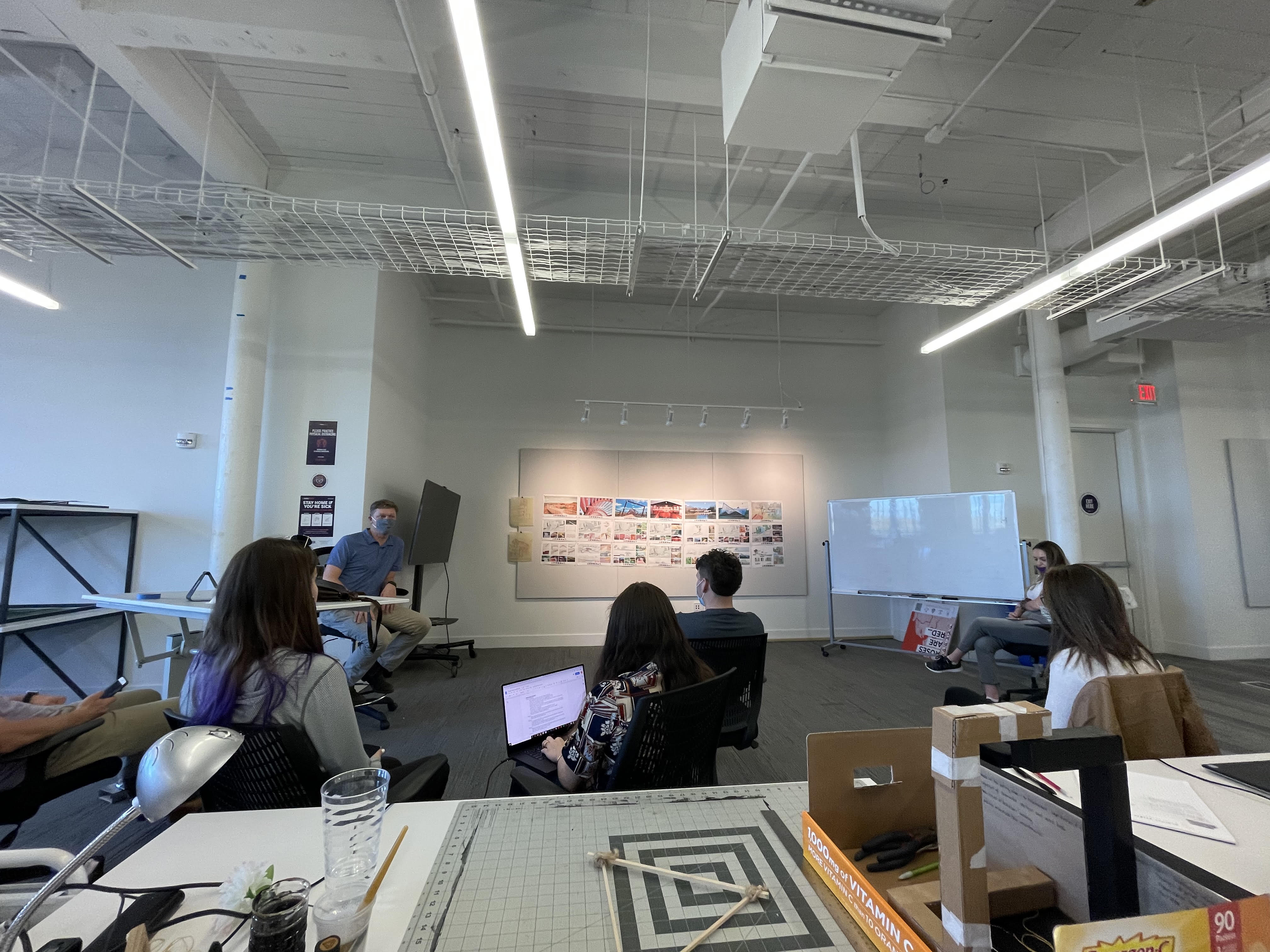 Friday was a very fun and collaborative day in studio! We pulled our chairs together around the pin-up wall and monitor to share our design iterations that we created in small groups over the week. The great thing about splitting into groups at this point in the semester is that we all created designs that were all unique and totally different. This really allowed us to think outside the box and compare different designs. We had a lengthy discussion on what concepts we favored and what worked well within the site, then we voted as a class to decide which design we wanted to move forward with.