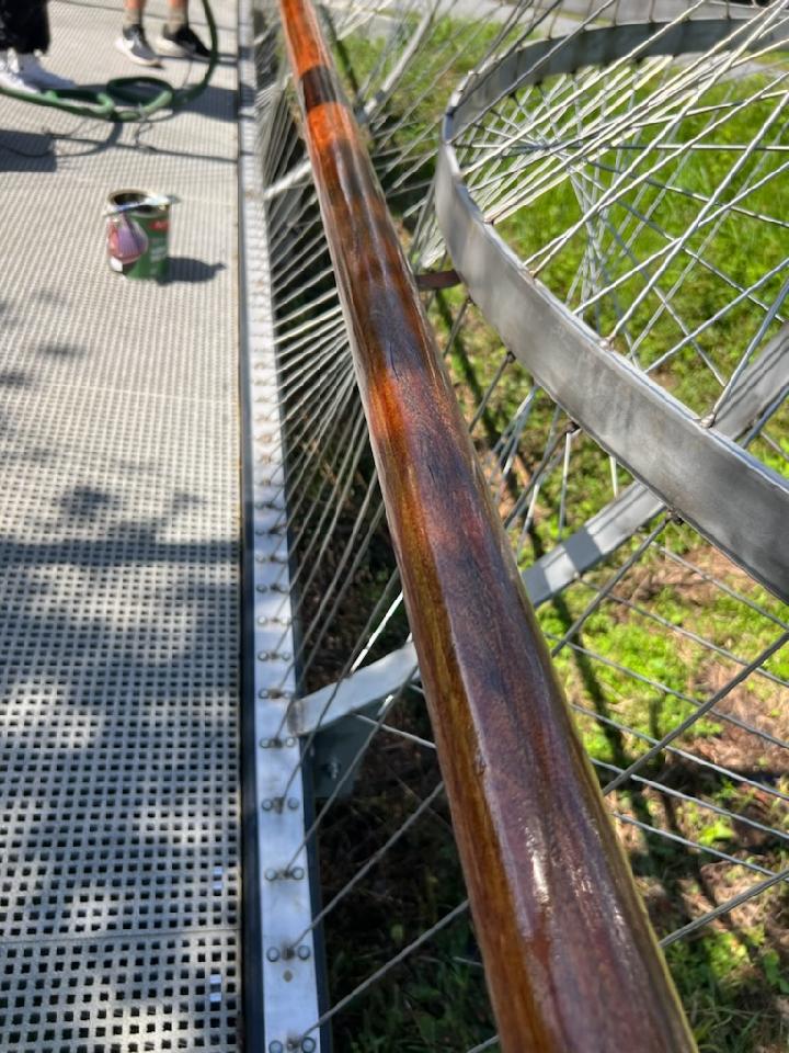 Hosting a recently broken handle and overrun by pesky weeds, Forest Park’s beloved bridge was deeply in need of repair when we began to work on it. Slicing through a multitude of weeds and prying determined vines off of the steel dowels, we battled bugs in the hot sun. Next, the repair of the now sharp handle was due. After re-attaching the broken part of the handle, we glued it back together armed with epoxy and a clamp.